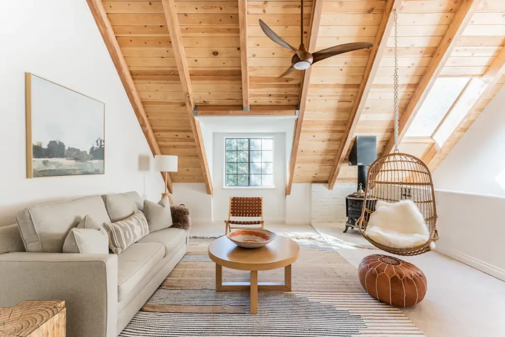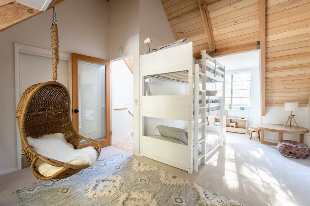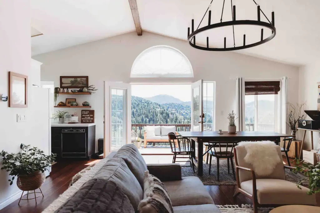 This three-bedroom loft features entertaining amenities that will bring the whole group together. One of our favorite rooms is the movie theater which features a 100-inch screen and has Roku streaming capabilities for the whole family to enjoy. Located near Lake Arrowhead Village and Skypark, guests get to enjoy 10 percent off entry to the latter during their stay.